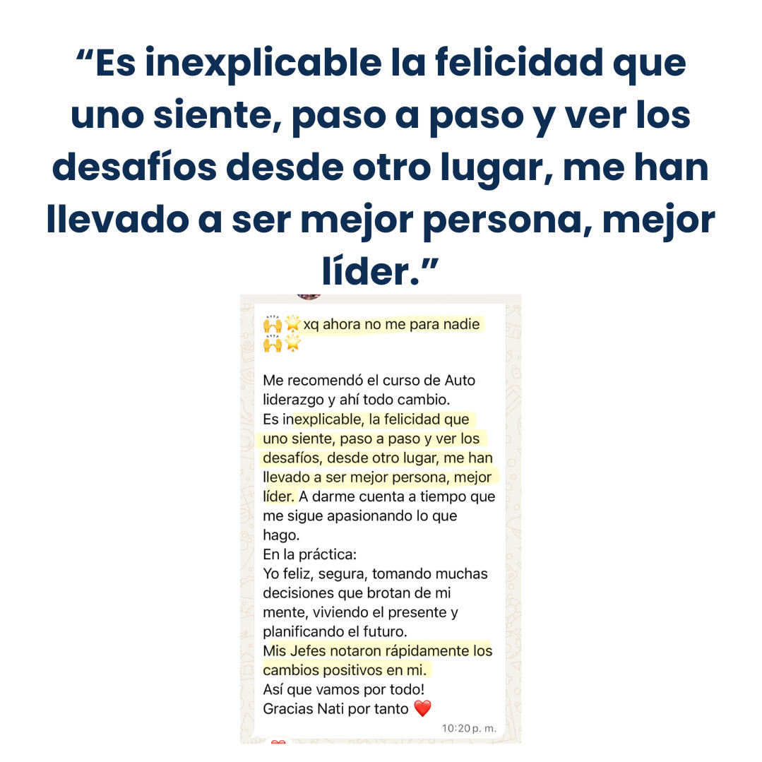 🔥 Cómo liderarte a ti misma primero, para que dejes de reaccionar en automático y empieces a tomar decisiones con claridad y confianza. (Con herramientas prácticas aplicables en tu día a día).🔥 Cómo identificar las oportunidades de mejora y crecimiento inteligente para desarrollar una mirada estratégica en tu liderazgo y equipo (vas a aprender una herramienta para aplicarla en tu autoliderazgo, equipo y procesos).🔥 Cómo lograr que tu equipo sea autónomo sin depender de vos todo el tiempo para actuar, desde tu propio autoliderazgo y herramientas prácticas.🔥 Cómo entrenar tu mente y tu energía para responder de manera estratégica y no reaccionar, proyectando calma y dirección.🔥 Cómo tomar decisiones asertivas y estratégicas para avanzar sin dudas, incluso cuando la presión es alta (vas a aprender modelos mentales para la toma de decisiones efectivas).🔥 Cómo poner límites con firmeza y elegancia para proteger tu tiempo, tu energía y tu poder personal.🔥 Cómo definir prioridades, y ser efectiva en el uso del tiempo, para elevar tu productividad y la de tu equipo (vas a aprender herramientas aplicables para ti y tu equipo y comiences a generar un equipo de alto rendimiento).🔥 Cómo liderar con equilibrio para lograr grandes resultados sin desconectarte de tu bienestar ni de tu vida personal.🔥Cómo mantener viva tu visión y propósito para que tu liderazgo se sienta auténtico, inspirador y sostenible a largo plazo.🔥 Cómo usar herramientas prácticas de priorización y enfoque, para que tu equipo trabaje motivado, alineado y con mayor efectividad.🔥 Cómo dejar de apagar incendios diarios a convertir problemas en palanca de crecimiento tanto para ti como para tu equipo.