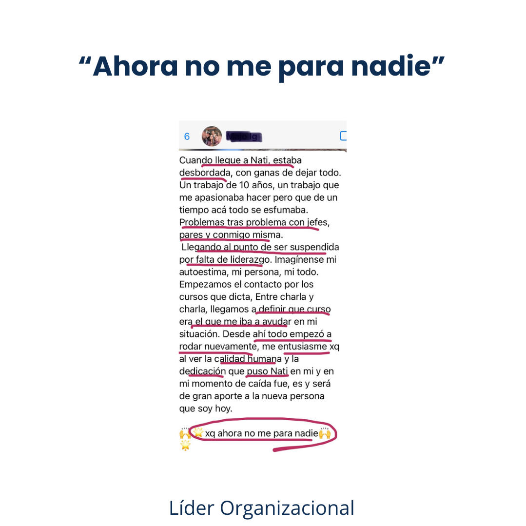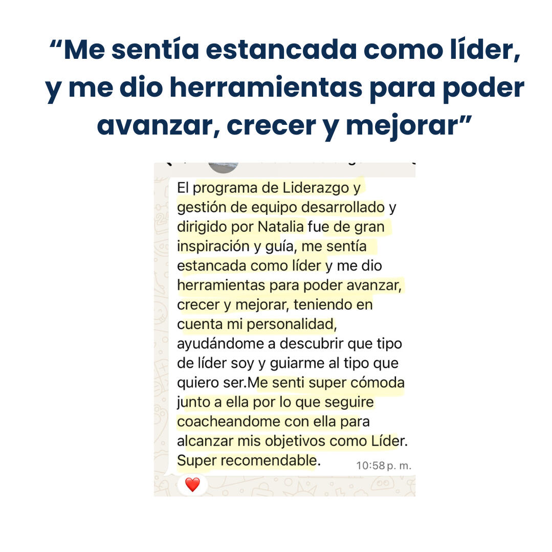 Natalia, es Licenciada en Relaciones Laborales. Se desempeño durante años en una empresa de más de 800 colaboradores, capacitando, desarrollando líderes, seleccionando talentos, fue reconocida por su nivel como Representante de cultura organizacional dentro de la empresa. Luego se abrió su propia marca y comenzó a liderar su negocio y desarrollar líderes.Una persona con un afán de siempre aprender más, lo que la caracteriza, es que crea sus propios métodos y estrategias uniendo toda su expertis y formación, en disciplinas que logran un alto rendimiento en las líderes y sus equipos, cómo: Neurociencias, PNL, EFT - Tapping, Comunicación asertiva, Coaching Ejecutivo, Líder Coach, Neurocoaching, entre otras.Sus programas son prácticos, estratégicos, con técnicas y herramientas que te llevas desde tu primer encuentro, listas para aplicar.Ha desarrollado decenas de líderes en diferentes rubros y sectores. Tanto a nivel organizacional - corporativo, como líderes empresariales con sus propias empresas y equipos.Bienvenida a potenciar tu liderazgo e impacto en los demás. Estás en el lugar correcto.